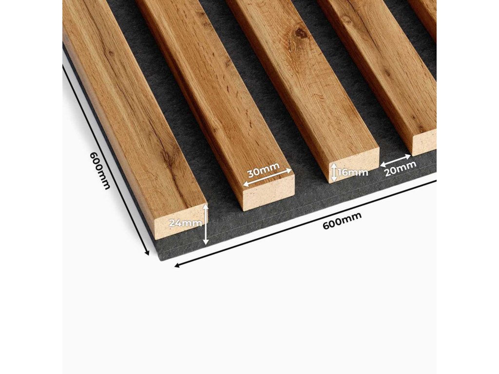 3D akustické panely v odtieni dub wotan sú možnosťou pre všetkých, ktorí chcú nadčasovú a zároveň originálnu dekoráciu steny alebo stropu. Akustické panely tohto typu sa na prvý pohľad veľmi ľahko zamenia so skutočným, masívnym drevom. Tieto vlastnosti ocení každý, kto miluje prírodné prvky v interiéroch, vďaka ktorým môžete priestor ľahko zútulniť a dodať mu jedinečný charakter. Akustické panely, ktoré ponúkame na filcovej podložke, majú rozmery 60 cm x 60 cm a je možné ich inštalovať vertikálne, horizontálne, ako aj vytvárať geometrické vzory. Okrem skvelého vzhľadu sú panely veľmi praktické, opticky zväčšujú a tiež účinne odhlučňujú miestnosť. Ako nainštalovať akustické 3D panely? Montáž akustických panelov zvládne doslova každý. Stačí použiť príslušné lepidlo / napríklad Mamut glue high tack / a riadiť sa pokynmi výrobcu. Ak máte akékoľvek otázky alebo pochybnosti, sme tu, aby sme vám pomohli. Rozmery Akustický 3D panel: Dĺžka 60 cm. Šírka 60 cm. Medzera medzi lamelami je 2 cm. Rozmer lamely je šírka 3 cm a hrúbka 1,6 cm. Hrúbka filcovej podložky je 8 mm.