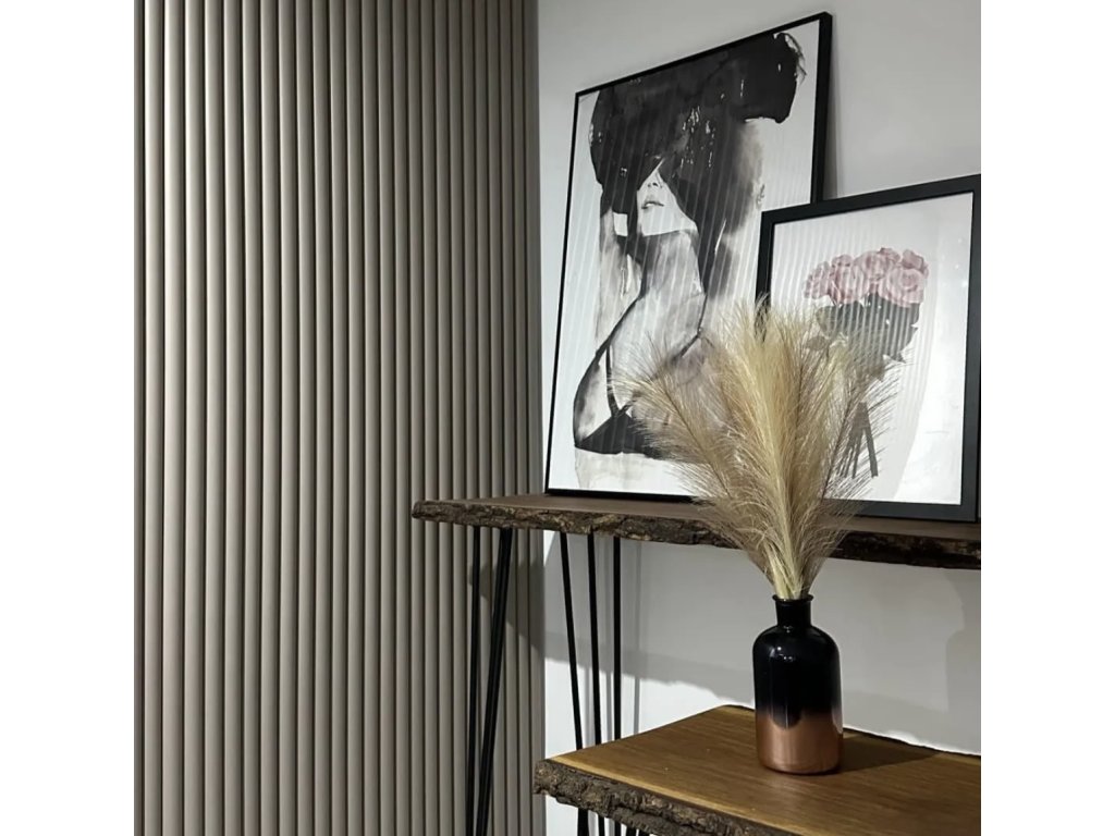 Akustický dizajnový panel v odtieni Kašmír s filcovým podkladom a zaoblenými lamelami prináša štýlový vzhľad a vynikajúce akustické vlastnosti pre každú miestnosť. Ideálne riešenie pre tých, ktorí hľadajú estetiku aj funkčnosť v interiéri.