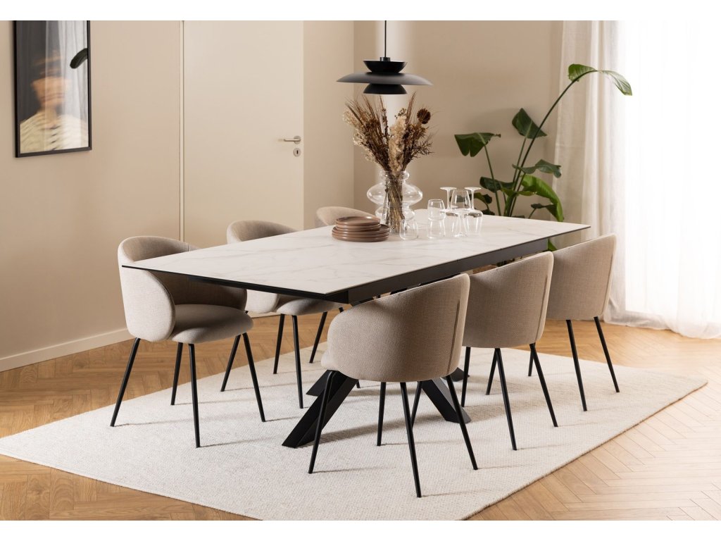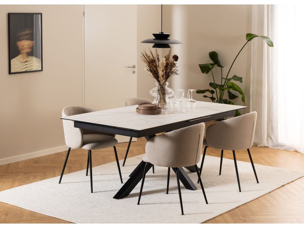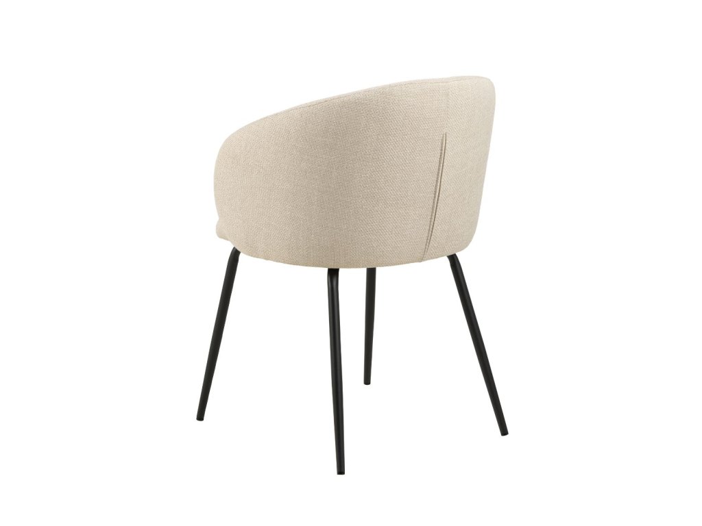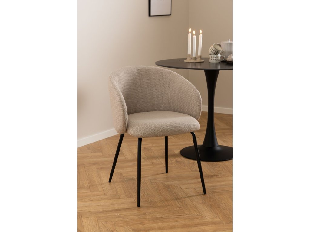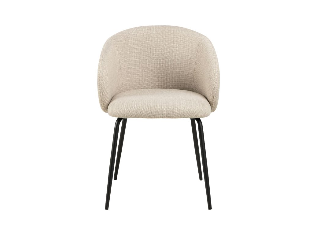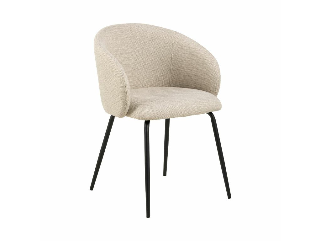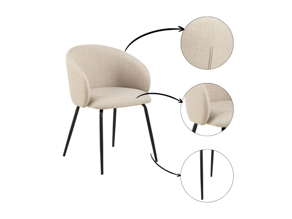 Elegantná stolička s podrúčkami s čiernou kovovou podnožou a čalúnením béžovou látkou s vysokou odolnosťou proti oderu.