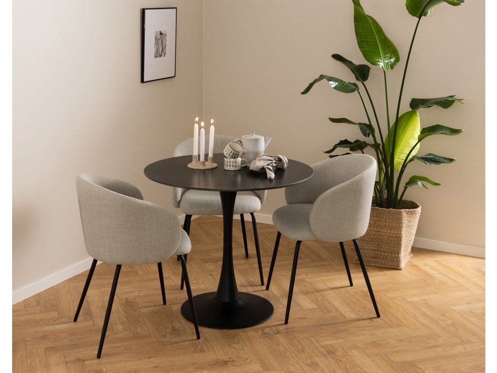 Jedálenská stolička Eleanor s podrúčkami je elegantný kúsok, ktorý sa hodí do akejkoľvek gastro prevádzky, reštaurácie, kaviarne ale aj do priestorov hotelov a domácnosti. Sedadlo a operadlo stoličky sú čalúnené odolnou béžovou látkou a poskytujú pohodlné sedenie. Čierne kovové nohy vytvárajú štýlový kontrast a zároveň zaisťujú odolnosť. Rozmery stoličky: Výška 79 cm. Šírka 55,5 cm. Hĺbka 55 cm. Výška sedadla 49,5 cm. Šírka sedadla 48 cm. Hĺbka sedadla 46 cm. Výška lakťovej opierky je 70 cm.
