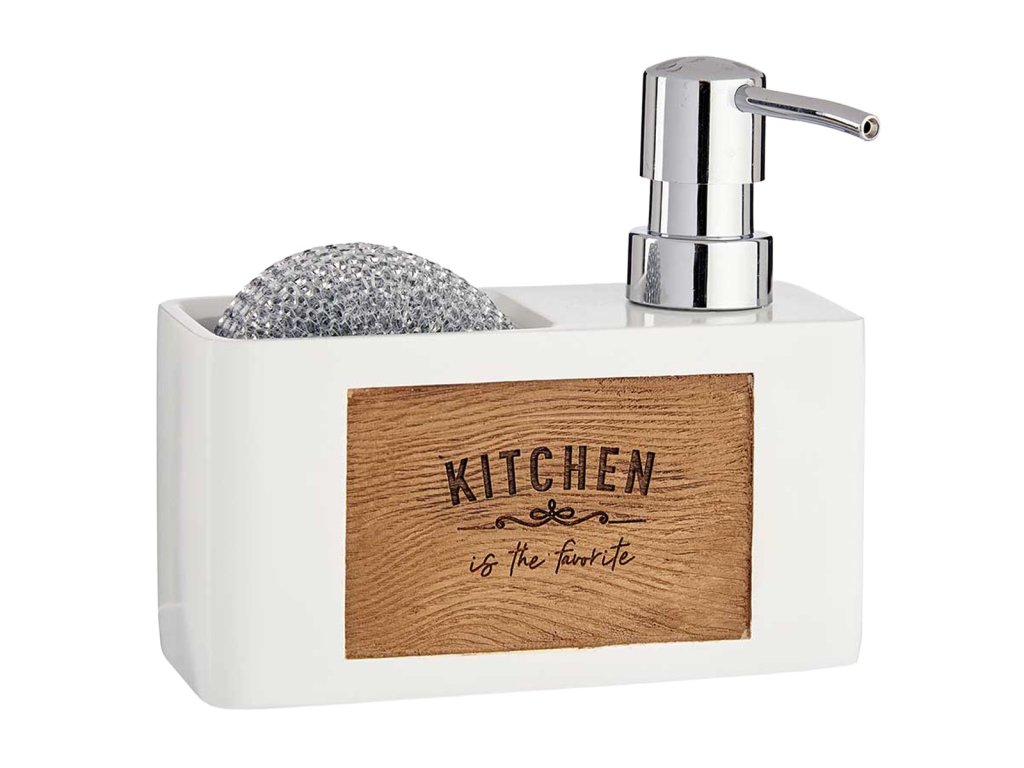 Táto štýlová a praktická kuchynská sada 2 v 1 je perfektným riešením pre každú kuchyňu. Skladá sa z dávkovača umývacieho prostriedku a priehradky na špongiu (súčasťou balenia). Vyrobená z odolného plastu v klasickej bielej farbe s panelom s efektom dreva a nápisom „Kitchen is the favorite“, dodá eleganciu každému kuchynskému priestoru. Jej kompaktné rozmery šetria miesto pri dreze a zároveň zaisťujú jednoduché používanie. Nie je to len funkčný, ale aj dekoratívny prvok.