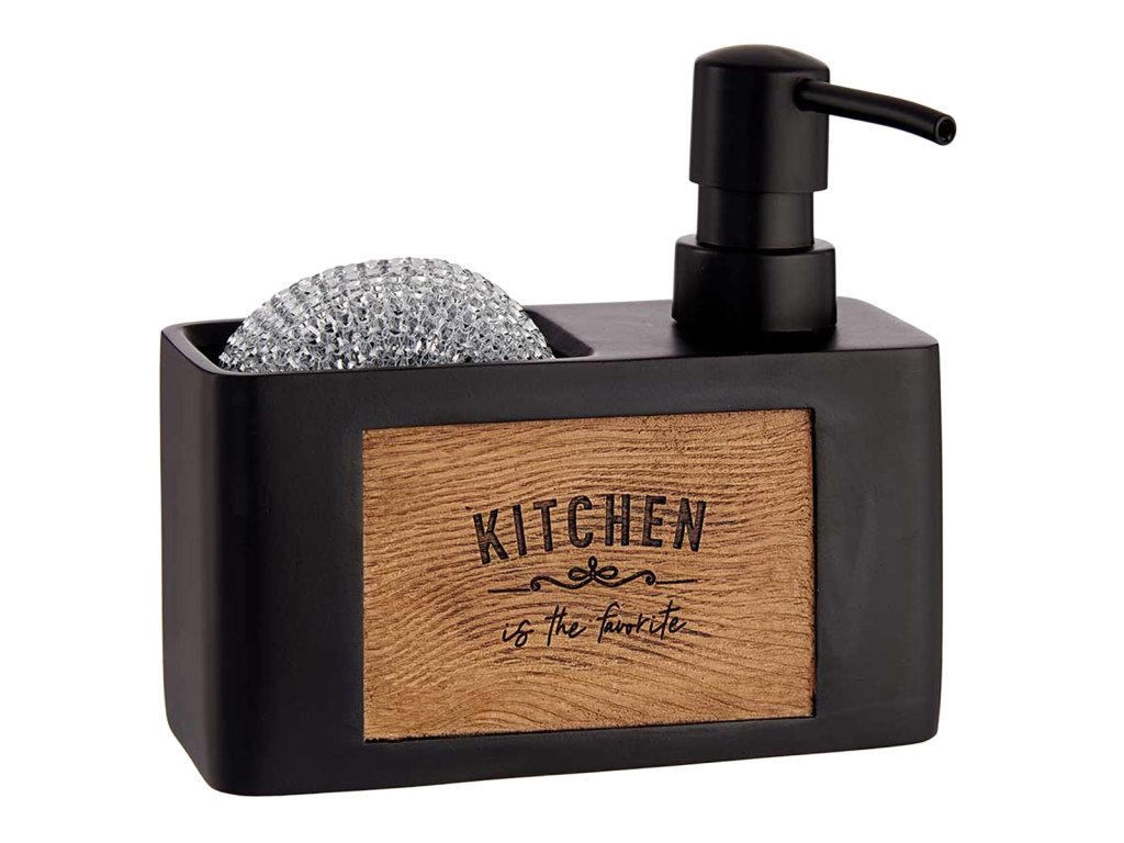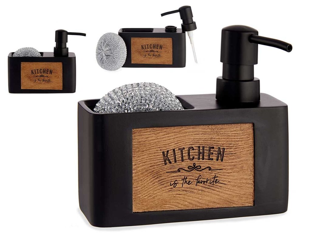 Táto štýlová a praktická kuchynská sada 2 v 1 je perfektným riešením pre každú kuchyňu. Skladá sa z dávkovača umývacieho prostriedku a priehradky na špongiu (súčasťou balenia). Vyrobená z odolného plastu v klasickej čiernej farbe s panelom s efektom dreva a nápisom „Kitchen is the favorite“, dodá eleganciu každému kuchynskému priestoru. Jej kompaktné rozmery šetria miesto pri dreze a zároveň zaisťujú jednoduché používanie. Nie je to len funkčný, ale aj dekoratívny prvok.