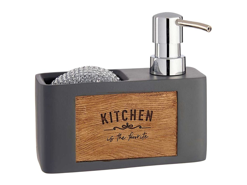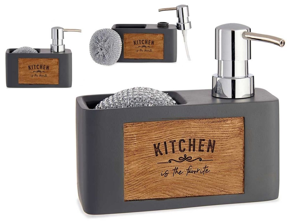 Táto štýlová a praktická kuchynská sada 2 v 1 je perfektným riešením pre každú kuchyňu. Skladá sa z dávkovača umývacieho prostriedku a priehradky na špongiu (súčasťou balenia). Vyrobená z odolného plastu v modernej sivej farbe s panelom s efektom dreva a nápisom „Kitchen is the favorite“, dodá eleganciu každému kuchynskému priestoru. Jej kompaktné rozmery šetria miesto pri dreze a zároveň zaisťujú jednoduché používanie. Nie je to len funkčný, ale aj dekoratívny prvok.