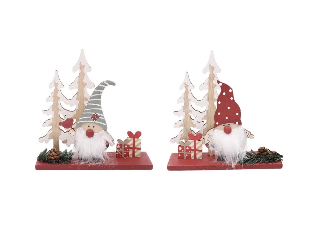 Tieto drevené vianočné dekorácie v podobe škriatkov so snehobielymi bradami, darčekmi a stromčekmi vytvoria dokonalú sviatočnú atmosféru. Jeden škriatok má pruhovanú sivú čiapku a drží v ruke červeného vtáčika, zatiaľ čo druhý škriatok je ozdobený červenou čiapkou s bielymi bodkami. Oba stoja na pevnom červenom podstavci, ktorý je doplnený dekoráciami v podobe zelených konárikov a šišky. Ich veselý dizajn je ideálny na ozdobenie vianočného stola, poličky alebo okna. Kombinácia prírodného dreva a veselých farieb prinesie do vášho domova šarm a pohodu počas vianočných sviatkov.
