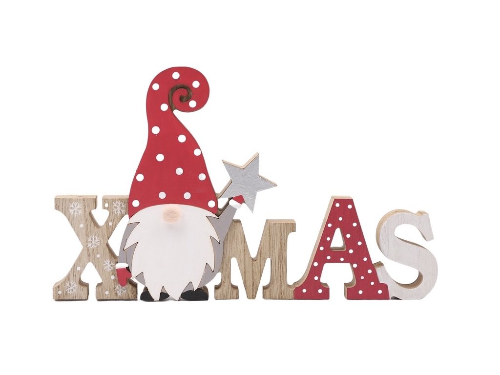 Vianočná dekorácia ozdobená pôvabnou postavičkou škriatka s červenou bodkovanou čiapkou a hviezdičkou v ruke. Jednotlivé písmená tvoria nápis „XMAS“ v kombinácii prírodného dreva a vianočných farieb.