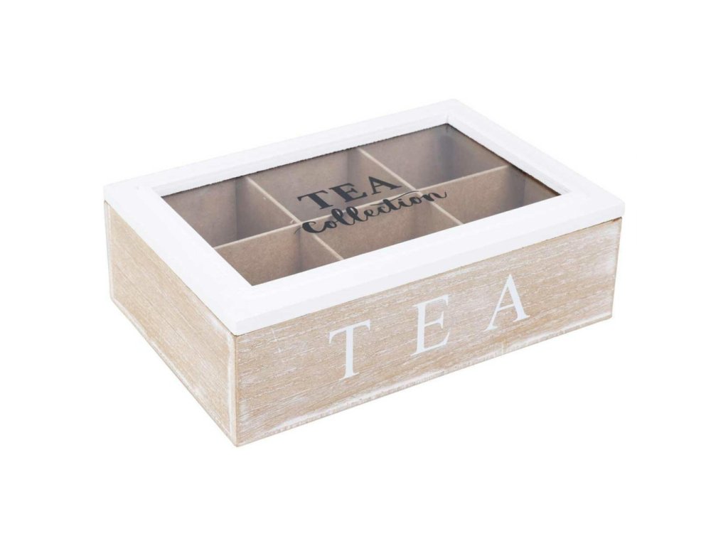 Drevená kuchynská nádoba na uskladnenie čaju, má 6 priehradiek a sklenený kryt.