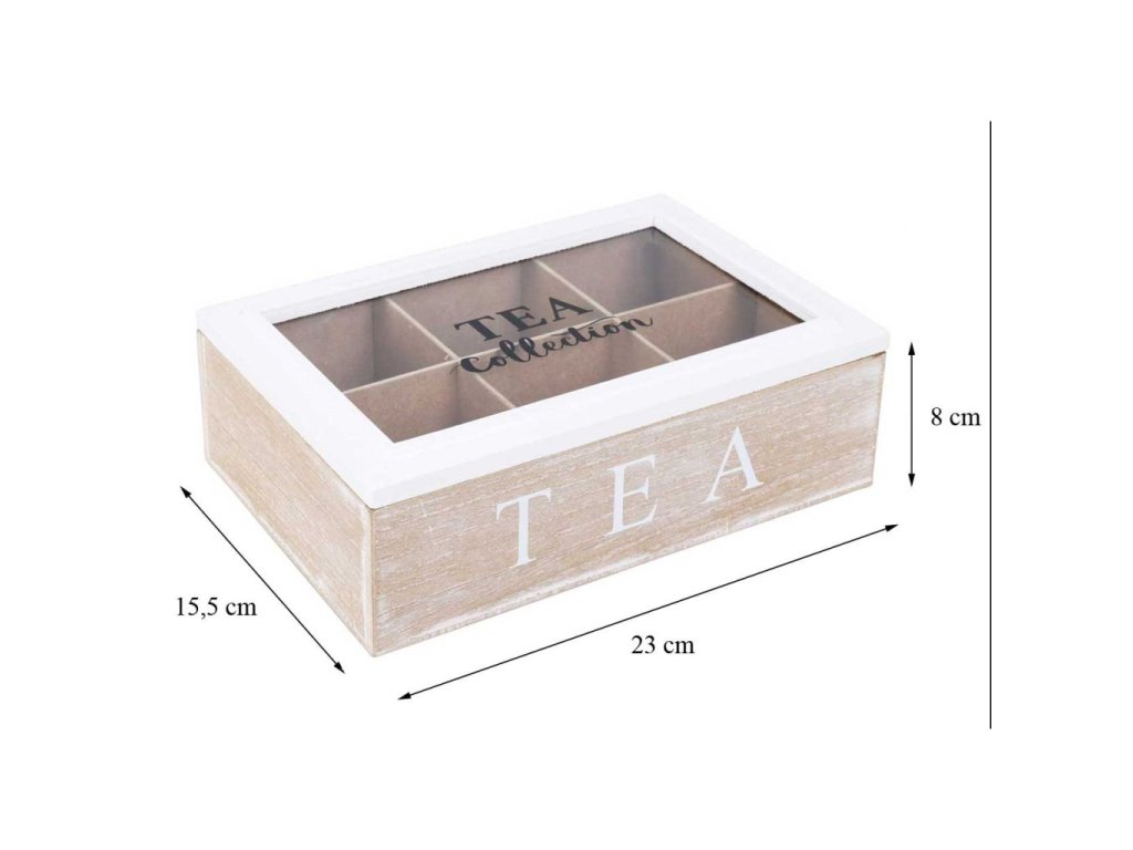 Štýlová drevená nádoba na čaj je nevyhnutným artiklom, ktorý nesmie chýbať v kuchyni každého milovníka tohto nápoja. Čajová skrinka má šesť priehradiek, ktoré vám umožnia uložiť veľké množstvo čajových vrecúšok a oddeliť rôzne druhy nápojov. Čajová škatuľka je uzavretá, čo ju ochráni pred hmyzom a prachom a navyše si dlhšie zachová arómu. Rozmery: Šírka 23 cm. Výška 8 cm. Hĺbka 15,5 cm.
