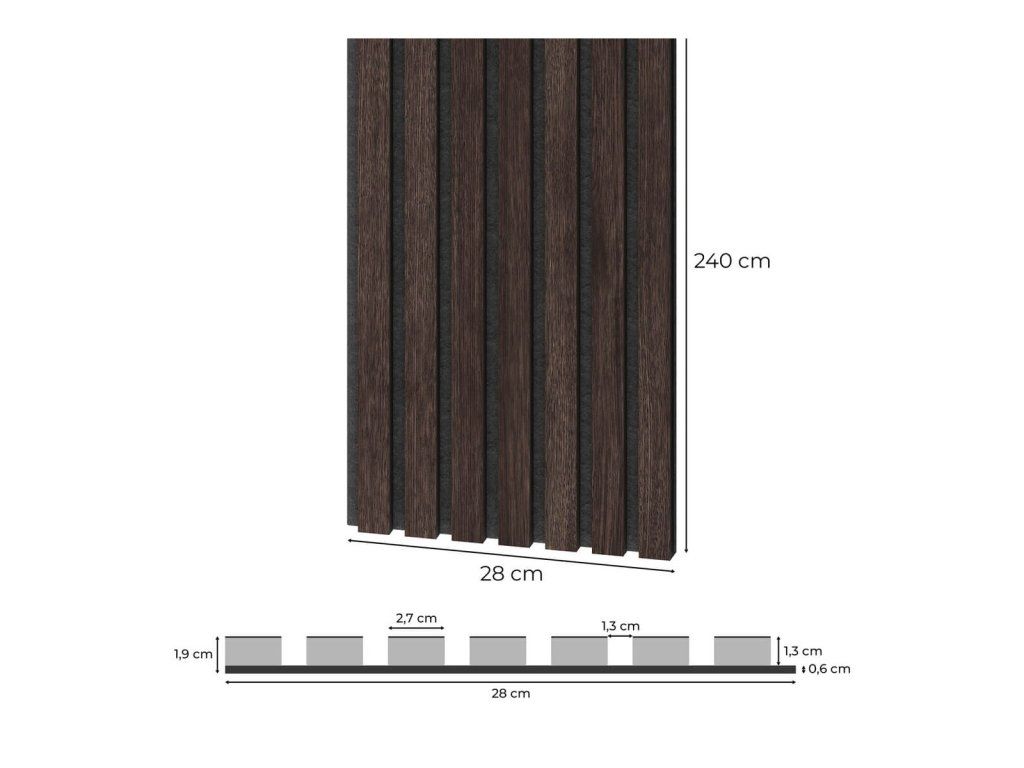 Dubové dýhované lamely v elegantnom gaštanovom odtieni sú dizajnovým riešením, ktoré nepochybne premení celý interiér. Panely majú akustické vlastnosti a možno ich použiť v domácnosti aj v rôznych verejných interiéroch. Možno ich montovať na steny, stropy aj na nábytok ako dizajnový doplnok. Podkladom akustického panela je 7 mm hrubý filc, ktorý je v čiernej farbe. Lamely sú vyrobené z 12 mm hrubej čiernej MDF dosky dýhované dubovou dýhou v povrchovej úprave gaštan. Lamela je dlhá 240 cm, široká 2,7 cm a hrubá 1,2 cm. Medzery medzi lamelami sú 1,3 cm. Celkové rozmery akustického panela: Dĺžka panela je 240 cm. Šírka je 28 cm. Hrúbka je 1,9 cm. Ako nainštalovať akustické panely? Montáž akustických panelov zvládne doslova každý. Stačí použiť príslušné lepidlo / napríklad Mamut glue high tack / a riadiť sa pokynmi výrobcu. Ak máte akékoľvek otázky alebo pochybnosti, sme tu, aby sme vám pomohli.