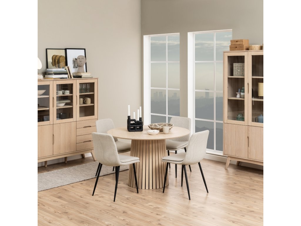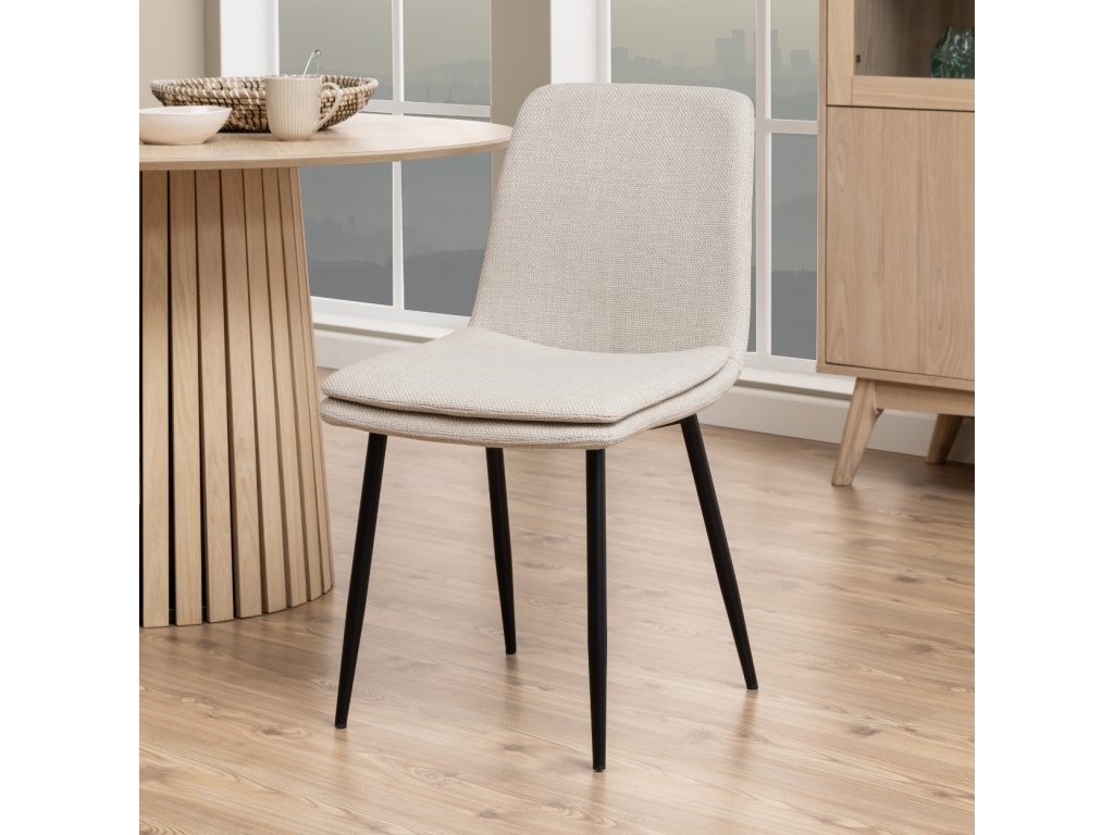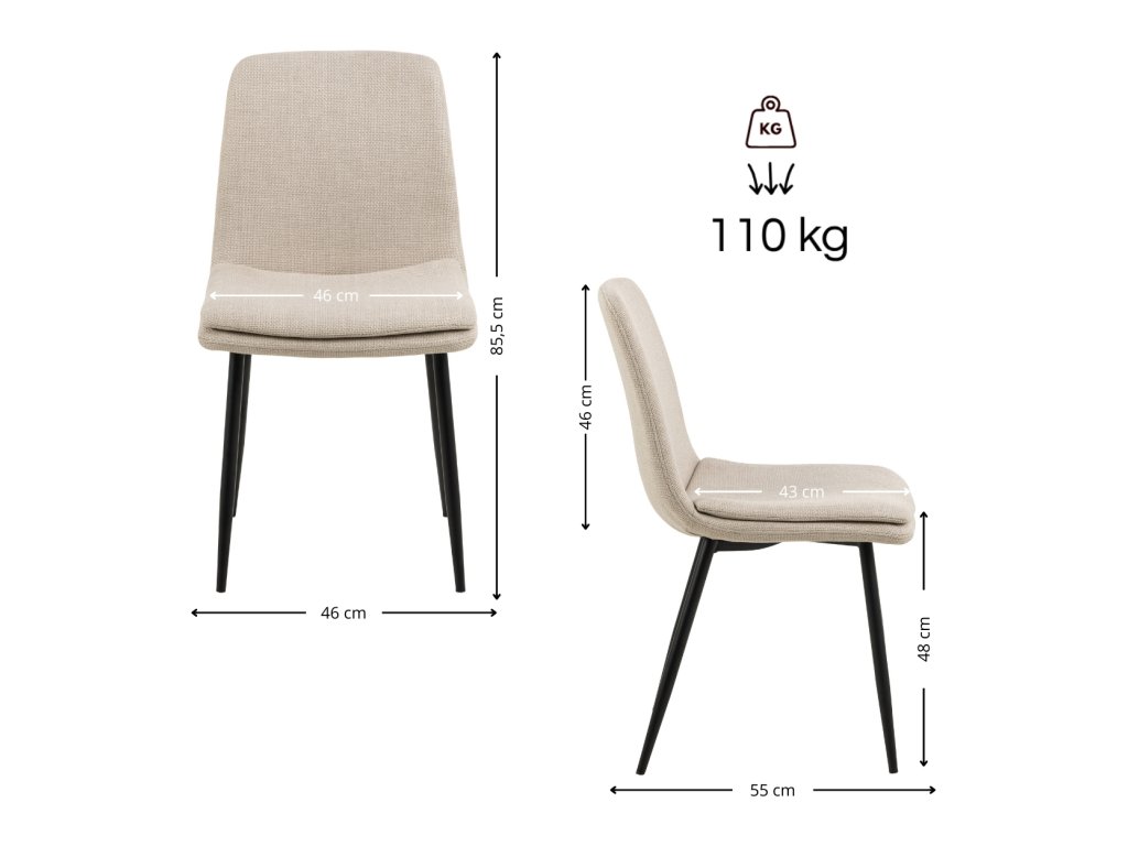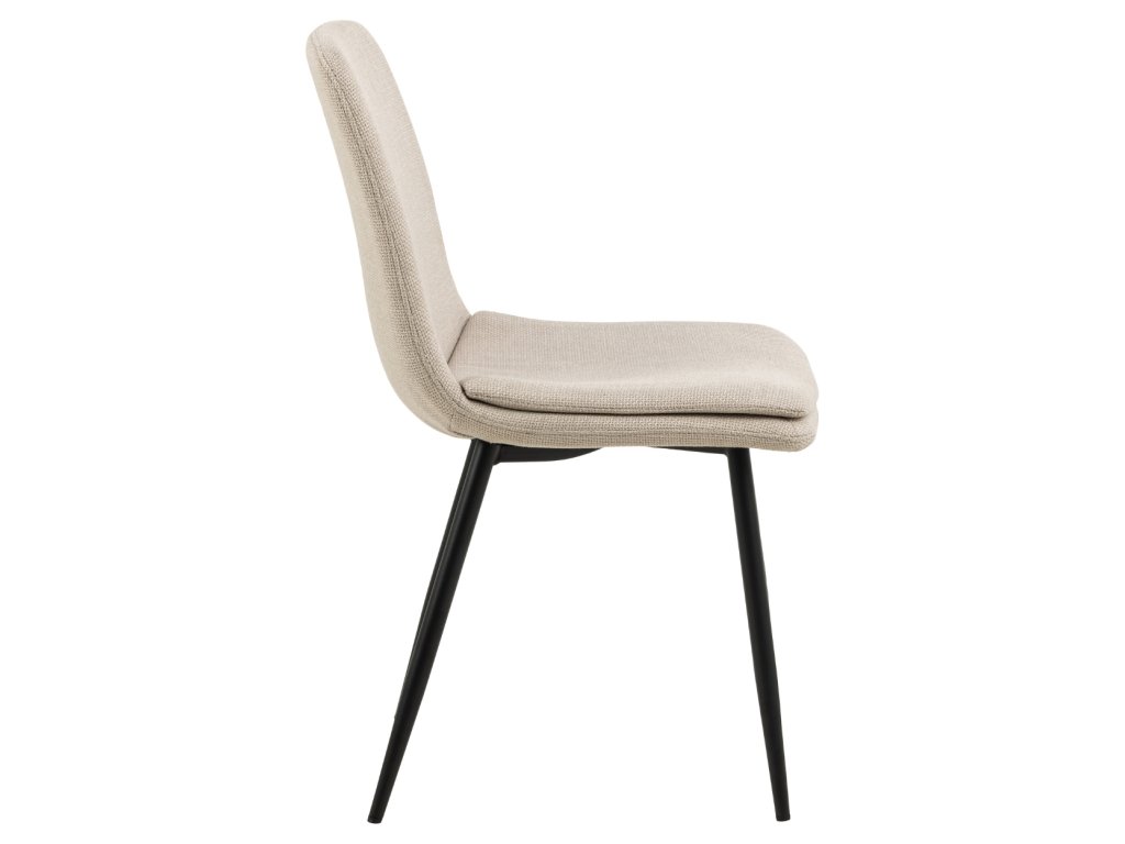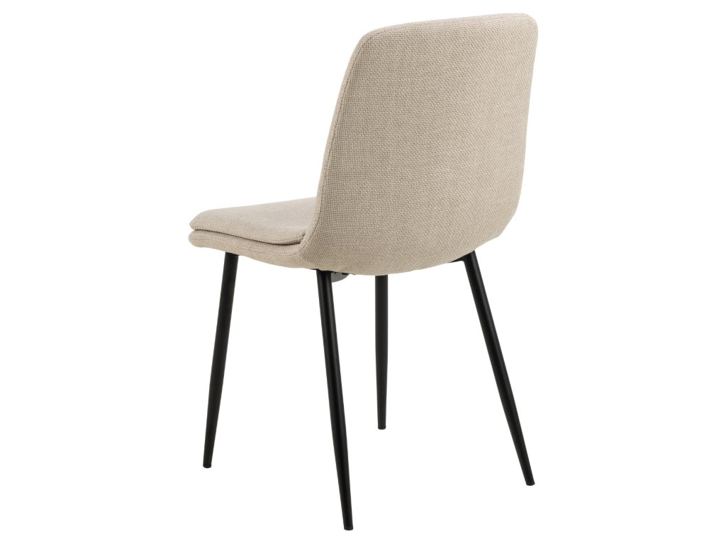 Moderná jedálenská stolička v jemnom béžovom odtieni zaujme kombináciou elegancie a pohodlia. Jej ergonomický tvar poskytuje pohodlnú oporu pri sedení. Dodatočná prešívaná vrstva sedadla zvyšuje pohodlie, vďaka čomu je ideálnou voľbou pre každodenné stolovanie aj dlhšie stretnutia či rokovania pri stole. Čalúnenie príjemnou béžovou látkou dodáva stoličke Becca jemnosť a eleganciu. Čierne kovové nohy zabezpečujú pevnosť, odolnosť a stabilitu. Stolička je vhodná do kuchyne, obývačky aj do komerčných priestorov reštaurácii a hotelov. Rozmery stoličky: Výška 85,5 cm. Šírka 46 cm. Výška sedadla 48 cm. Hĺbka sedadla 43 cm. Celková hĺbka stoličky je 55 cm. Nosnosť 110 kg.