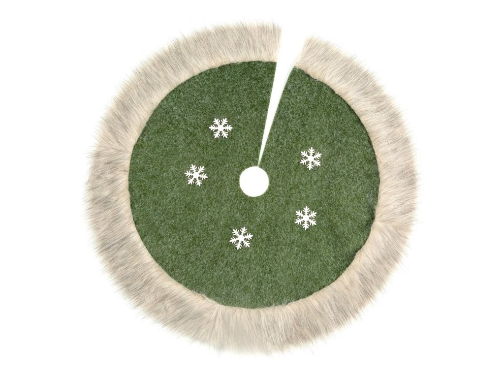 Vianočný koberec pod stromček s kožušinovým lemom a ozdobnými vločkami.