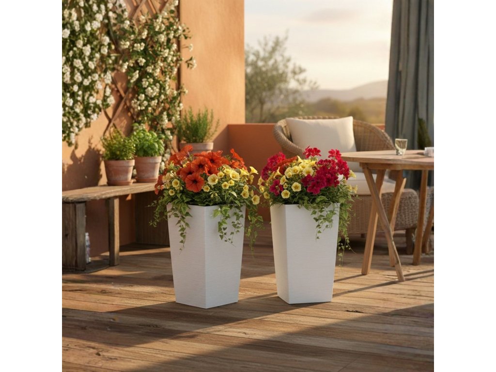 Kvetináč Porto v hranatom štvorcovom tvare je vhodný pre vnútorné aj vonkajšie priestory. Štvorcový hranatý tvar kvetináča efektne vystavuje rastliny bez toho, aby zaberal veľa miesta. Vhodný je do záhrady, na terasu, balkón alebo do interiéru. Vysoký a štíhly dizajn vám umožňuje vytvárať dekoratívne aranžmány s rastlinami, okrasnými trávami alebo kríkmi. Súčasťou balenia je vložka s hĺbkou 29 cm, ktorá zjednodušuje výsadbu a starostlivosť a poskytuje dostatočný priestor pre koreňový systém bez nutnosti zapĺňať celý kvetináč zeminou. Kvetináč je k dispozícii vo výškach 36cm, 46cm, 57cm, 67cm. Produkt je vyrobený z recyklovaného plastu. Kvetináč je dostupný v bielej a čiernej farbe. Ponuka platí len pre kvetináč zobrazený na prvej fotografii. Dekoratívne prvky vrátane kvetov a ozdôb zobrazených na fotografiách nie sú súčasťou predaja. Rozmery kvetináča 57x30x30 cm. Vložka do kvetináča má hĺbku 29 cm.