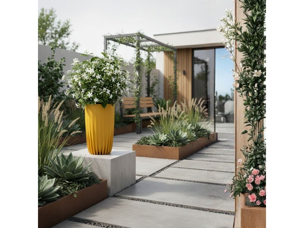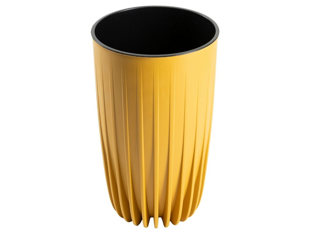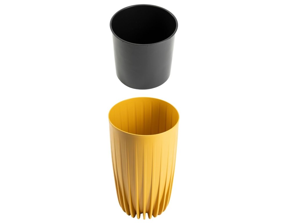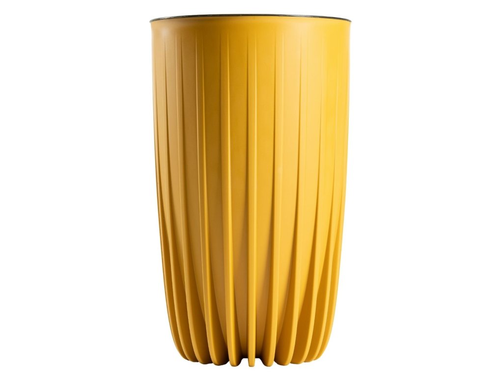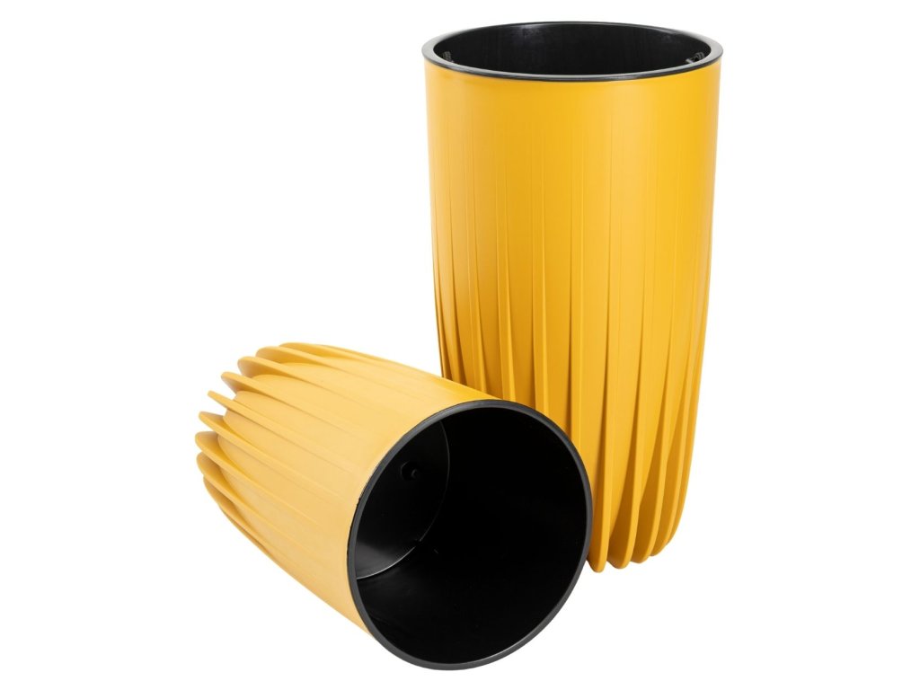 Moderný kvetináč so štíhlym valcovitým tvarom a výraznou dekoratívnou štruktúrou. Doplnený praktickou vyberateľnou vložkou.