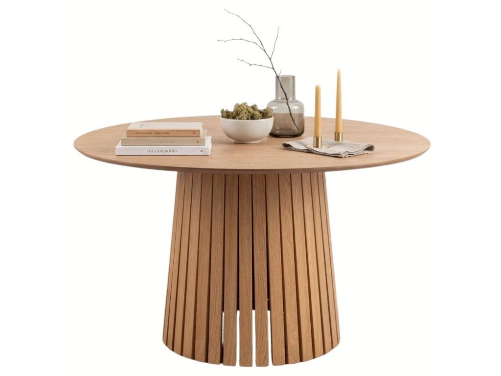 Jedálenský stôl v škandinávskom štýle s lamelovou podnožou. Okrúhly tvar stola v odtieni prírodného dubu vnáša do interiéru ľahkosť, harmóniu a eleganciu.
