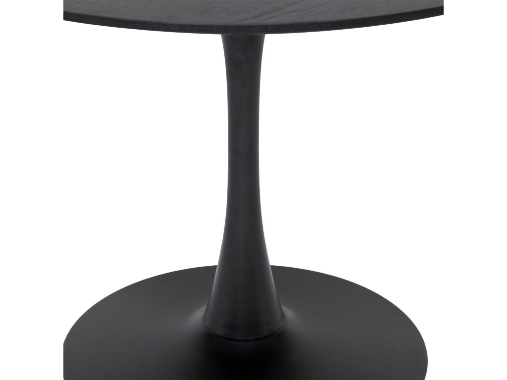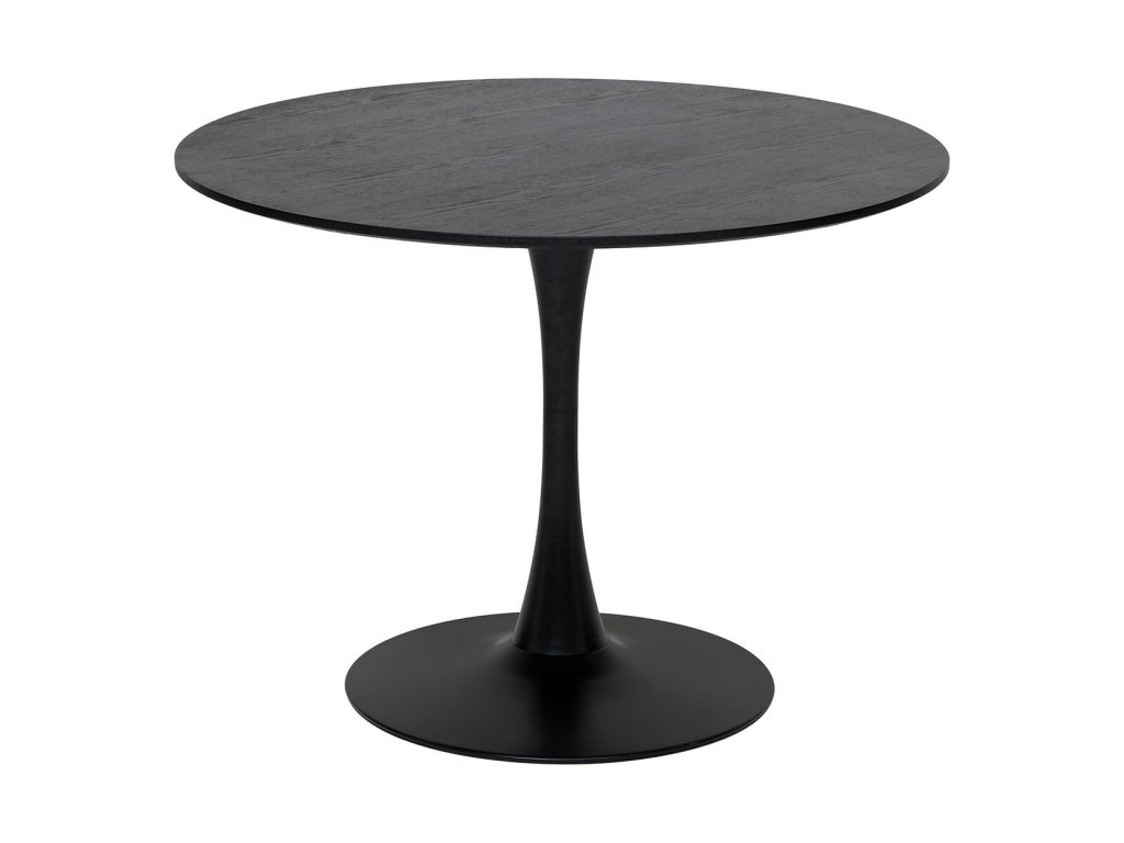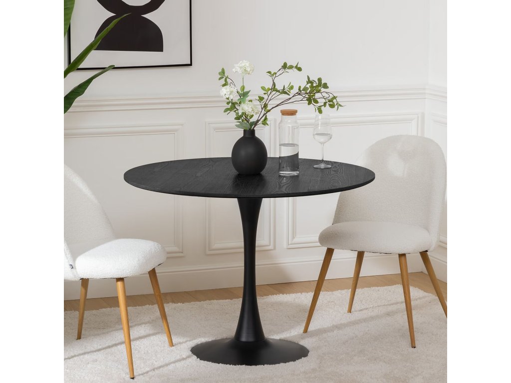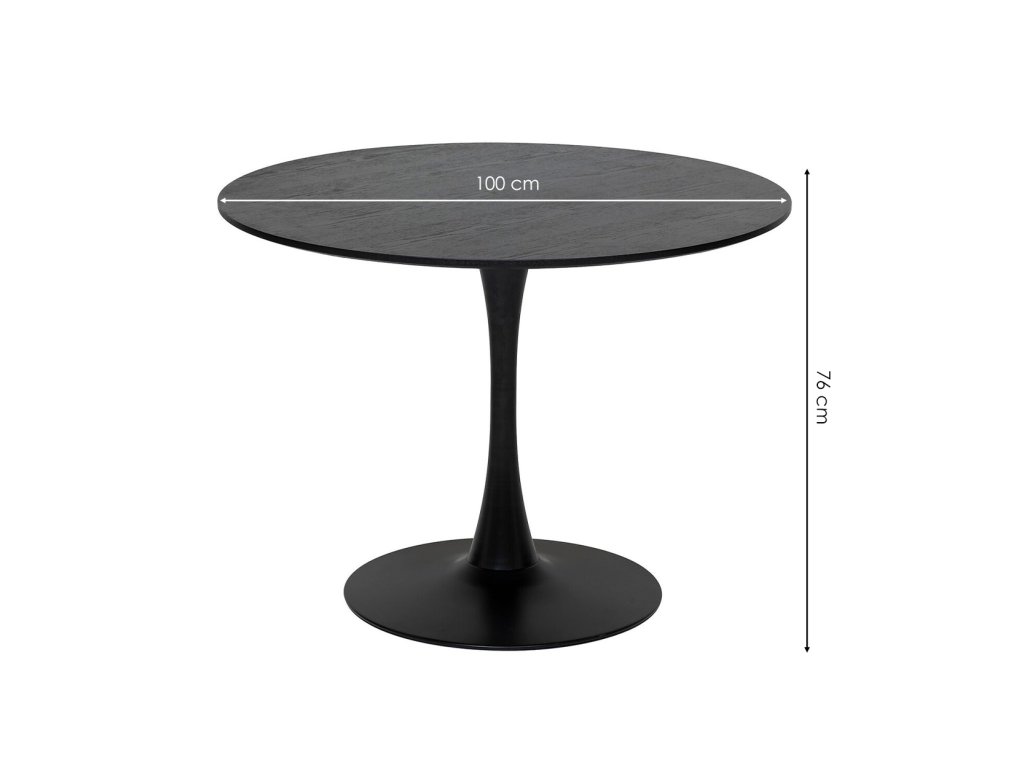 Okrúhly čierny jedálenský stôl kombinuje eleganciu s moderným minimalizmom. Vyrobený z MDF s dyhou v čiernom matnom odtieni vyzerá štýlovo a nadčasovo. Centrálna kovová noha dodáva stolu ľahkosť a stabilitu s nosnosťou až 65 kg. Zároveň umožňuje usporiadanie stoličiek okolo stola. Je ideálny pre štyri osoby a je perfektný do jedálne, kuchyne alebo obývačky, kde vytvára príjemný priestor na spoločné stolovanie a stretnutia. Tento stôl kombinuje nadčasový dizajn s praktickosťou a zdôrazňuje prirodzenú krásu materiálov. ROZMERY: Výška stola 76 cm. Priemer stola 100 cm.