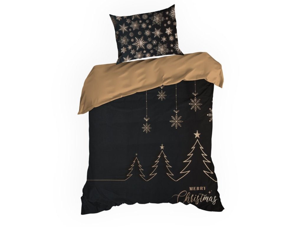Bavlnená posteľná súprava Renforce ASTRA v elegantnej čiernej farbe, zdobená motívom hviezdy a vianočného stromčeka, rozmer 140x200 cm, 1 obliečka na vankúš 70x80 cm