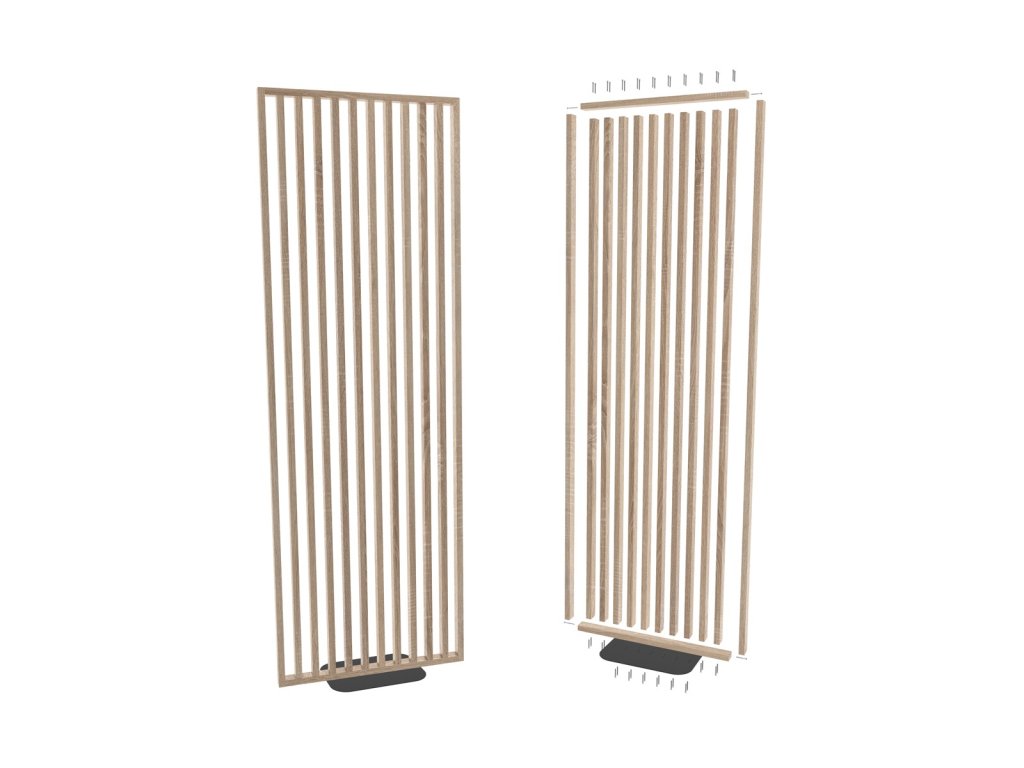 Samostatne stojaca predeľovacia lamelová stena v odtieni Dub Sonoma - moderný spôsob rozdelenia priestoru bez nutnosti vŕtania alebo trvalej inštalácie.