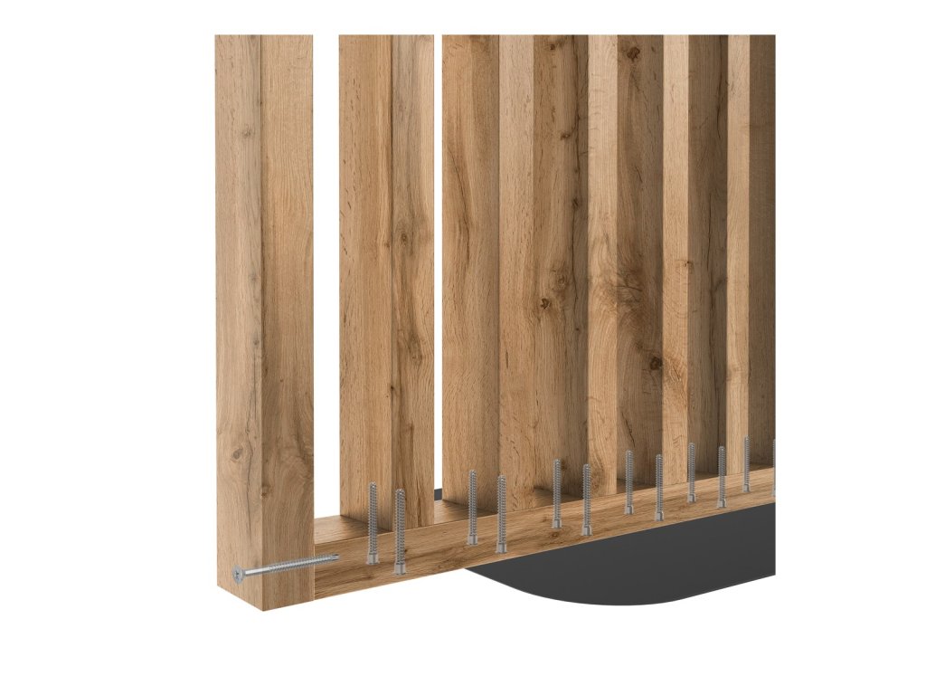 Voľne stojaca lamelová stena je elegantným a funkčným riešením bez nutnosti vŕtania. Lamely sú vyrobené z odolného MDF materiálu a laminované sú zo všetkých štyroch strán. Vyzerajú elegantne a sú ideálnym riešením pre rozdelenie interiéru v byte, kancelárii, kozmetickom salóne alebo na rôznych miestach, kde sa môže meniť dispozícia interiéru. Vďaka kovovému podstavcu je stena stabilná a zároveň jej polohu môžete meniť podľa svojich potrieb. Vyberte si šírku deliacej lamelovej steny, zadajte požadovanú výšku a postavte si mobilnú deliacu stenu na mieru. Montáž je rýchla a jednoduchá – dostanete kompletnú sadu pripravenú na montáž. Sada obsahuje potrebné montážne príslušenstvo: Samovŕtacie skrutky – 4 ks. 5 cm konfirmátové skrutky – množstvo zodpovedá počtu zvislých vnútorných lamiel (4 ks na lamelu). 7 cm dlhšie konfirmátové skrutky – potrebné na montáž podstavca (14 ks). Hmoždinky a skrutky – 2 ks. Horizontálne lamely na montáž vertikálnych lamiel s predvŕtanými otvormi pre konfirmátové skrutky Čierny kovový podstavec, 60 x 40 cm Okrúhle krytky ladiace s farebným dekorom lamiel.