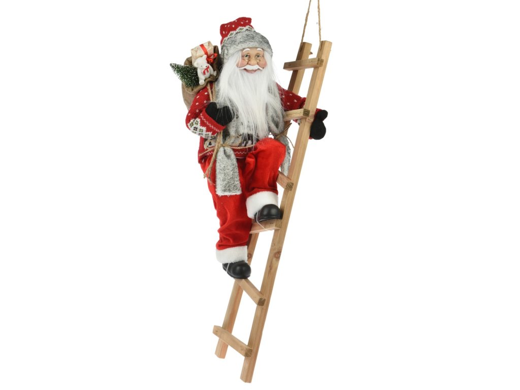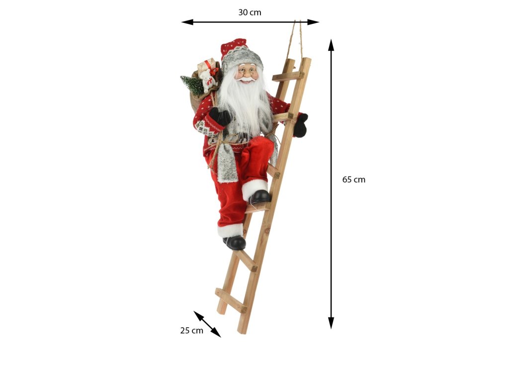 Santa oblečený v tradičnom červenom obleku lezie po rebríku. Prinesie do vášho domova radosť, vianočné kúzlo a vytvorí dojem, že sa chystá vstúpiť do vášho domova s darčekmi. Ideálna dekorácia na umiestnenie k vianočnému stromčeku, ku krbu alebo ku vchodu.