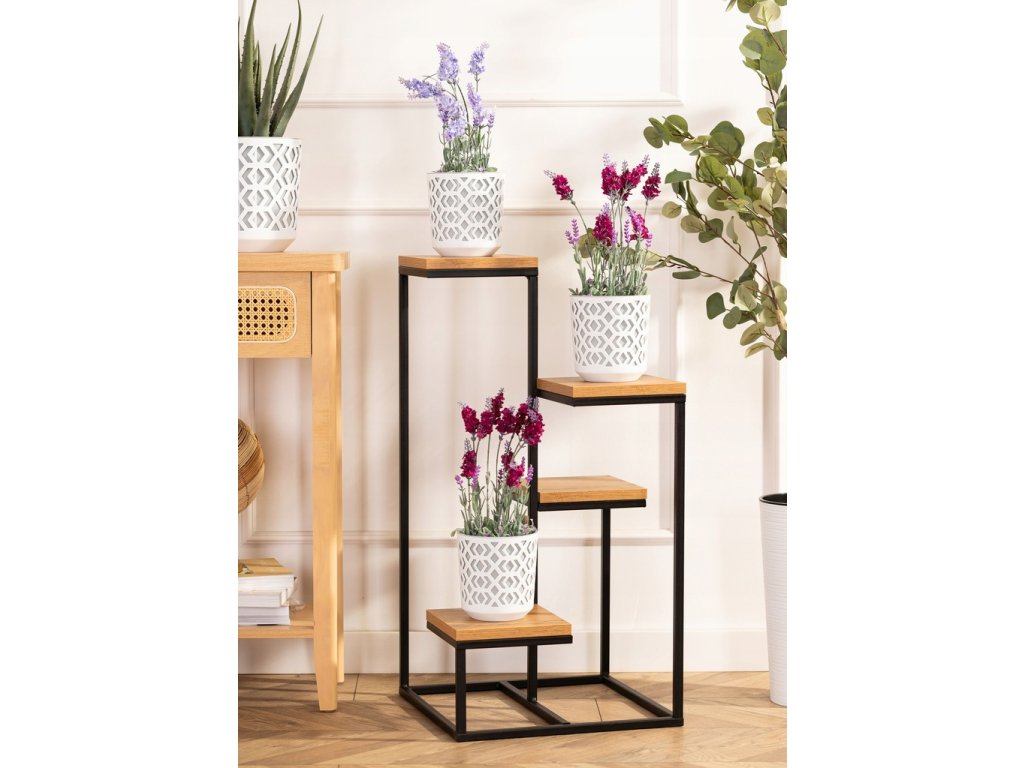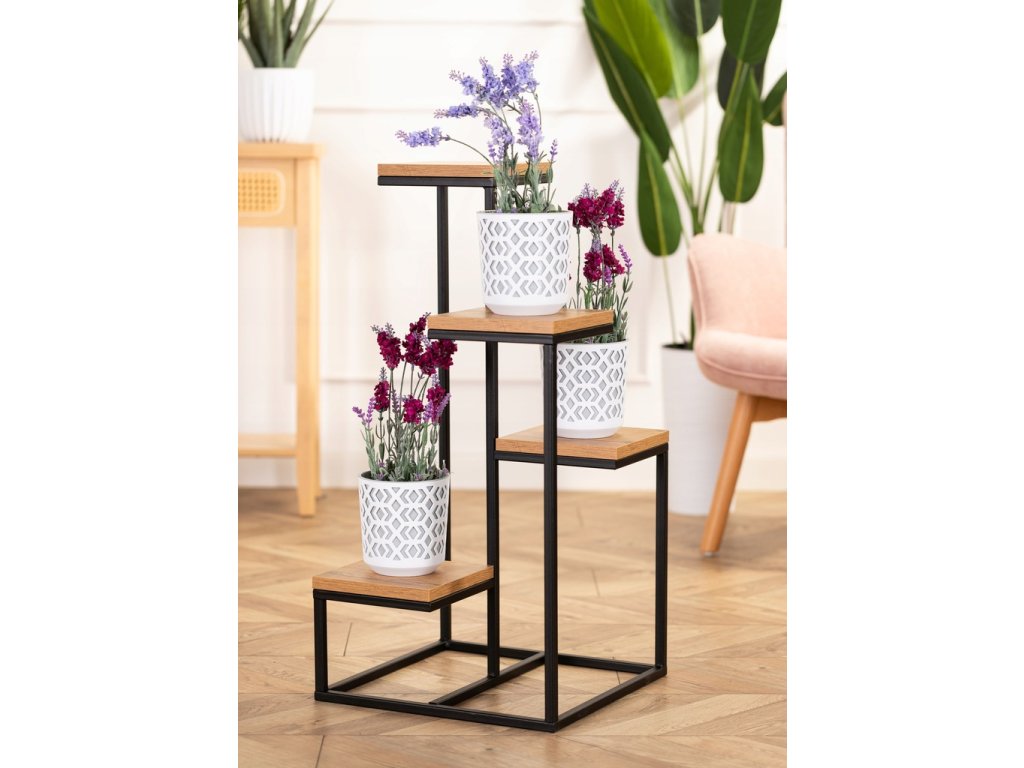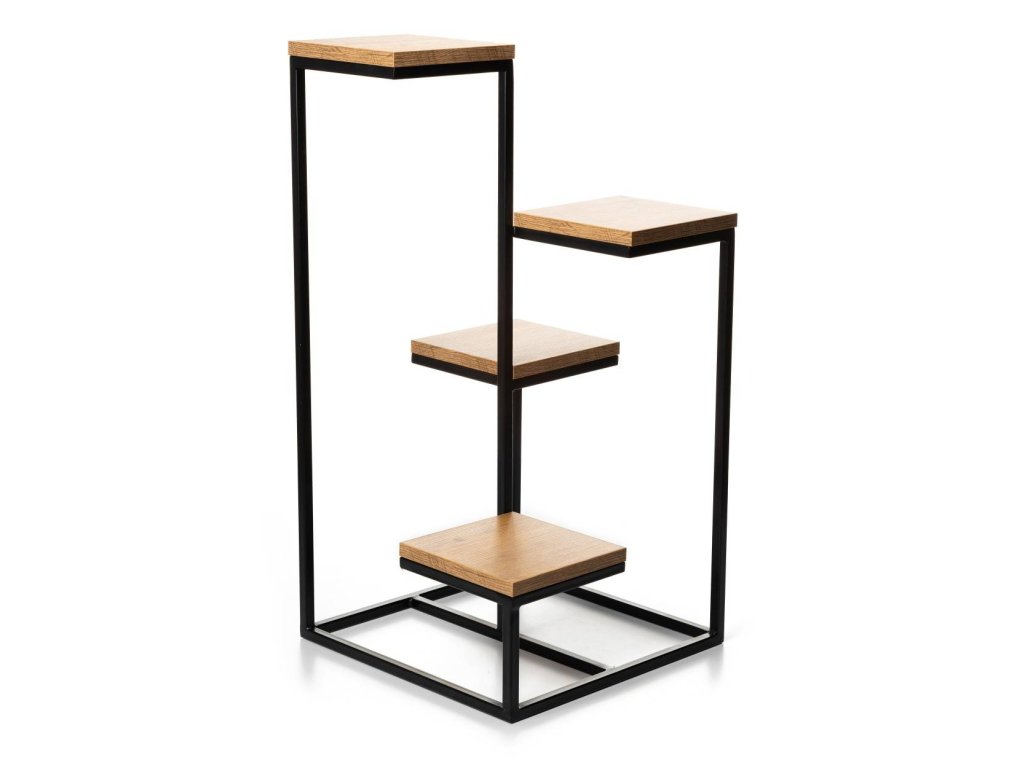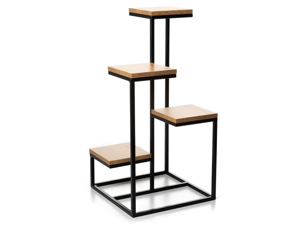 Štýlový stojan na kvety s 4 policami v dekore dubu a kovu. Výborný doplnok do moderného interiéru na prezentáciu rastlín aj dekorácií. Výška 79 cm.