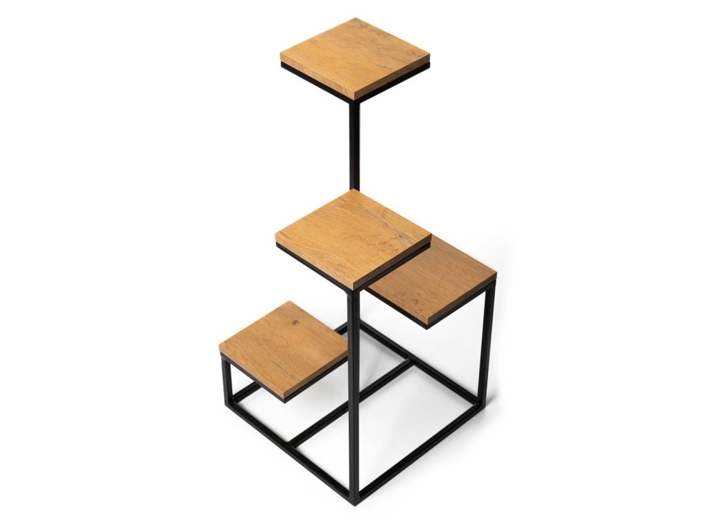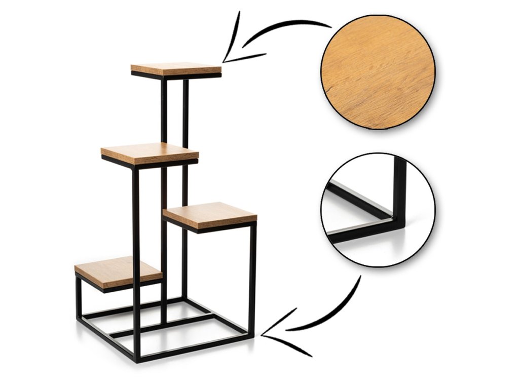 Stojan na kvety s 4 policami v loftovom štýle. Vďaka svojej jednoduchosti a jedinečnému dizajnu bude tento stojan perfektným doplnkom do každého bytu, izby alebo domu. Vďaka svojej pevnej a odolnej konštrukcii sa bude hodiť aj na balkón, záhradu, altánok alebo verandu. Konštrukcia stojana je vyrobená z kovu s čiernou povrchovou úpravou a police sú z MDF dosky v Dubovom odtieni. Stojan je odolný, ľahký a stabilný, vďaka čomu je vhodný na univerzálne použitie v domácnosti alebo záhrade. Stojan má štyri výškové úrovne.