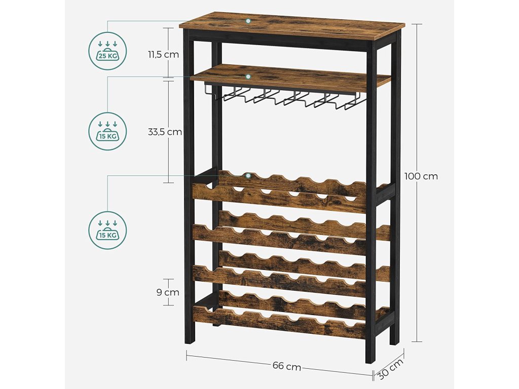 Stojan na víno a poháre - domáci bar. Je nielen funkčným prvkom interiéru, ale aj praktickým spojencom každého milovníka vína. Vďaka svojej elegancii, kapacite a trvanlivosti je nenahraditeľným prvkom vybavenia každej domácnosti. Vyznačuje sa pevným a detailným spracovaním. Ideálny kus nábytku pre ľudí, ktorí oceňujú funkčné a elegantné riešenia. Vďaka svojmu univerzálnemu dizajnu sa bar hodí do klasických aj modernejších interiérov. Pri jeho výrobe boli použité tie najkvalitnejšie materiály, vďaka čomu je výbornou voľbou pre každého, kto hľadá odolný a odolný nábytok, ktorý bude slúžiť dlhé roky. Keď sa rozhodujete pre kúpu vinotéky, vyberáte si overený produkt od uznávanej spoločnosti, ktorý nesklame vaše očakávania a umožní vám užívať si pohodlie a funkčnosť jej používania každý deň. Nosnosť hornej police - 25 kg, strednej - 15 kg, organizérov na víno - 15 kg.