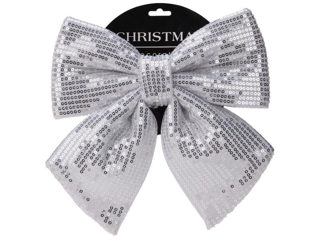 Strieborná mašľa s flitrami o veľkosti 25 cm dodá vašim vianočným dekoráciám eleganciu a sviatočný lesk. Ideálna na ozdobenie stromčeka, dverí či darčekov pre dokonalú vianočnú atmosféru.