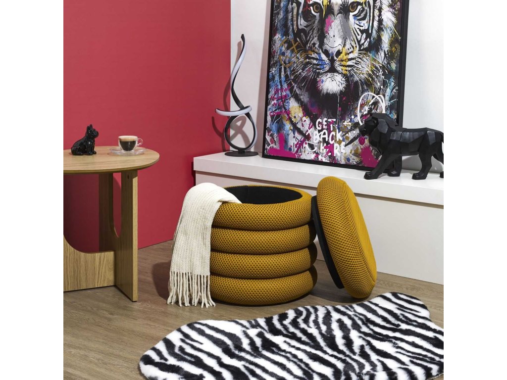 Moderný čalúnený taburet Kame kombinuje funkčnosť a dizajn. Je vyrobený z priedušnej 3D látky v modernej medovej farbe, poskytuje pohodlné sedenie a púta pozornosť svojím jedinečným tvarom. Jeho najväčšou výhodou je priestranný skrytý úložný priestor – ideálny na deku, hračky alebo drobnosti. Odnímateľný sedák umožňuje rýchly prístup do vnútra. Je stabilný, ľahký a ľahko sa premiestňuje, takže je ideálny do obývačky, detskej izby, chodby alebo domácej kancelárie. Vyrobený z materiálov s certifikátom FSC®, podporujete zodpovednú výrobu. Štýl, poriadok a pohodlie v jednom.