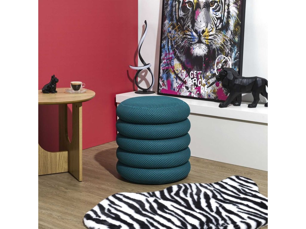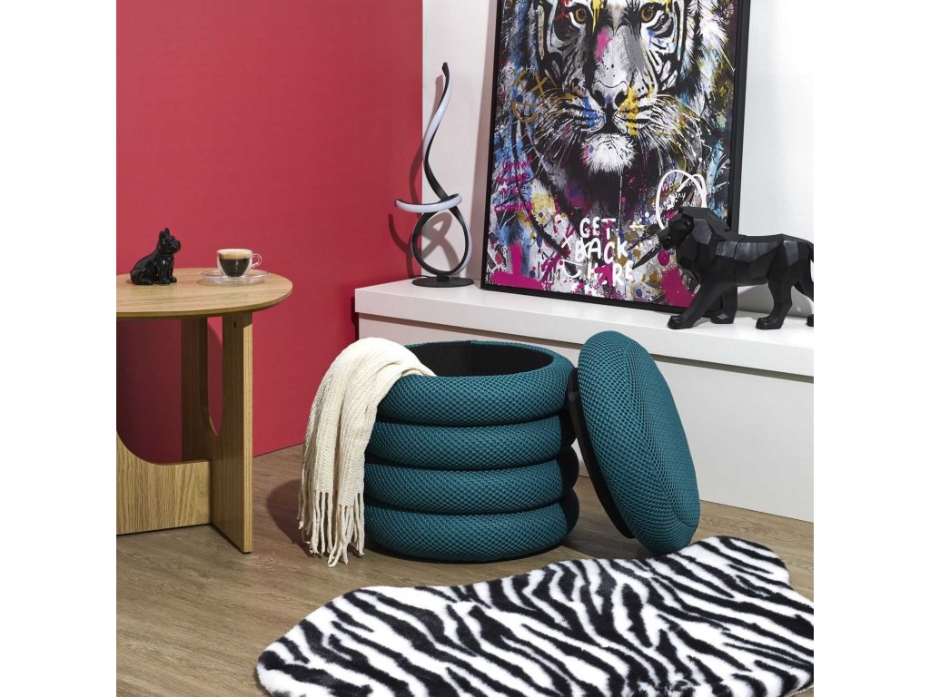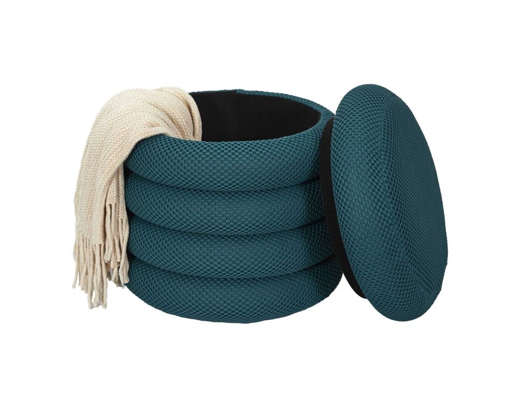 Moderný čalúnený taburet Kame kombinuje funkčnosť a dizajn. Je vyrobený z priedušnej 3D látky v modernej tyrkysovej farbe, poskytuje pohodlné sedenie a púta pozornosť svojím jedinečným tvarom. Jeho najväčšou výhodou je priestranný skrytý úložný priestor – ideálny na deku, hračky alebo drobnosti. Odnímateľný sedák umožňuje rýchly prístup do vnútra. Je stabilný, ľahký a ľahko sa premiestňuje, takže je ideálny do obývačky, detskej izby, chodby alebo domácej kancelárie. Vyrobený z materiálov s certifikátom FSC®, podporujete zodpovednú výrobu. Štýl, poriadok a pohodlie v jednom.