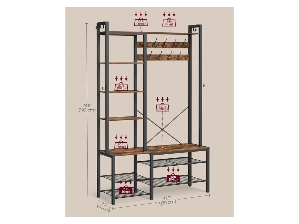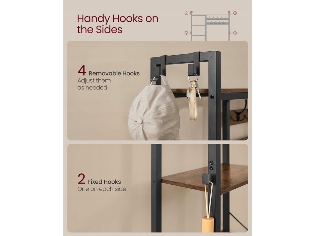 Regál do predsiene s úložným priestorom na topánky je vybavený ďalšími 5 policami a ponúka optimálne využitie priestoru, čím vytvára prehľadný a pohodlný vstupný priestor. S 9 trojitými háčikmi môžete zavesiť kabáty, tašky a šatky, zatiaľ čo 6 bočných háčikov je ideálnych na uloženie klobúkov, čiapok, dáždnikov, kľúčov a iných drobností, vďaka čomu budete mať všetky potrebné veci vždy po ruke. Do spodných sieťovaných políc sa zmestí 13-14 párov topánok a nastaviteľná výška police na topánky vľavo umožňuje flexibilné uloženie topánok rôznych veľkostí. Vďaka nastaviteľným nožičkám a ochrane proti prevrhnutiu je vešiak stabilný a zaisťuje bezpečnosť a rustikálny dizajn a farby sa budú hodiť do mnohých predsiení a šatníkov. ROZMERY: Výška 190 cm, Šířka 120 cm, Hĺbka 40 cm.