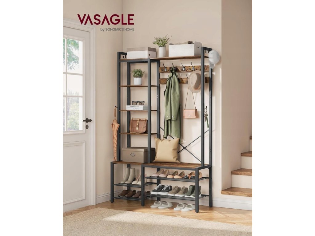 Praktický vešiakový stojan s lavičkou a botníkom v jednom. Ideálny do predsiene na organizované a štýlové uloženie obuvi aj odevov.