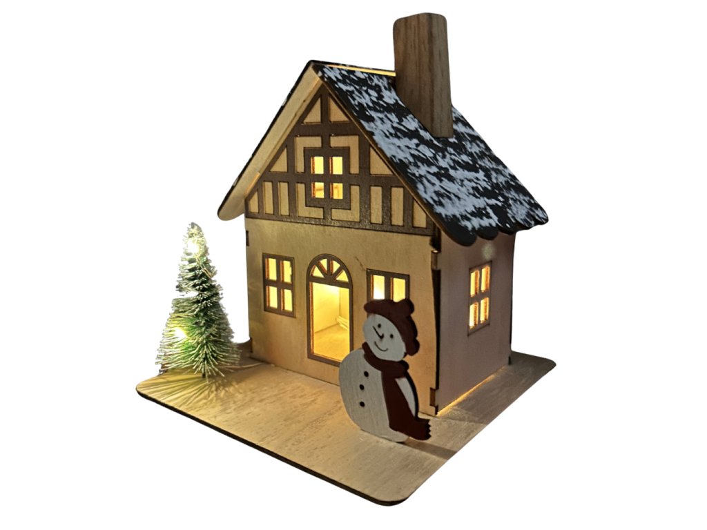 Dekoratívny vianočný domček vyrobený z dreva, doplnený o svetelný LED prvok, zasneženú strechu, malý stromček a snehuliaka. Slúži ako sviatočná dekorácia do interiéru, ktorá navodí príjemnú vianočnú atmosféru.