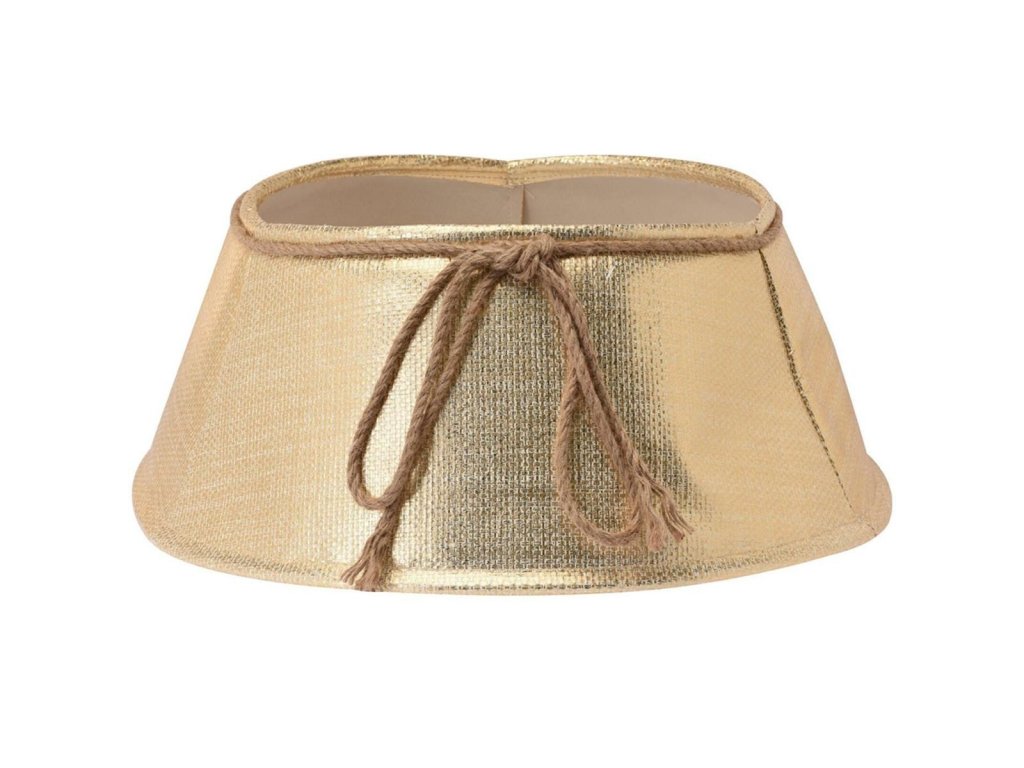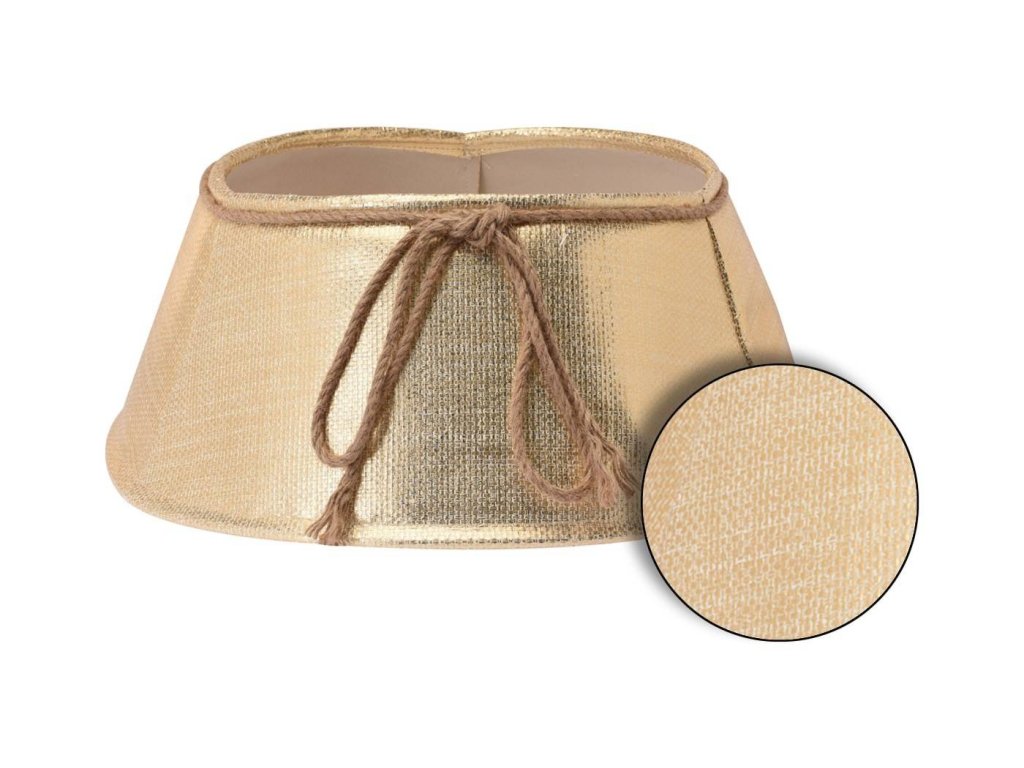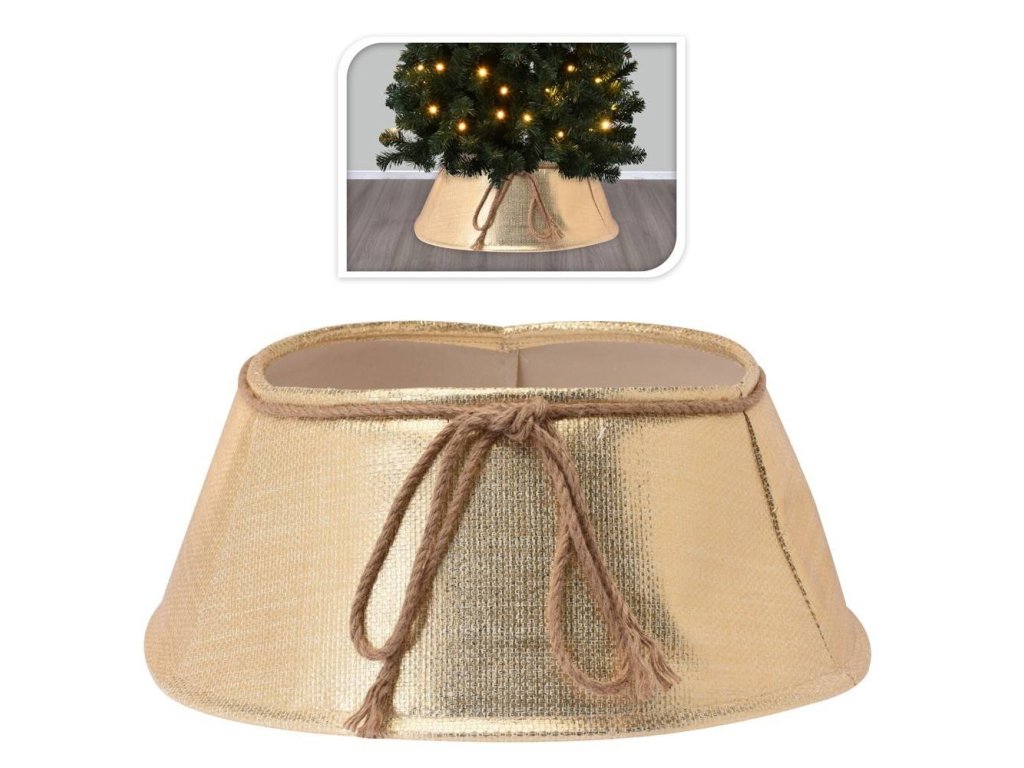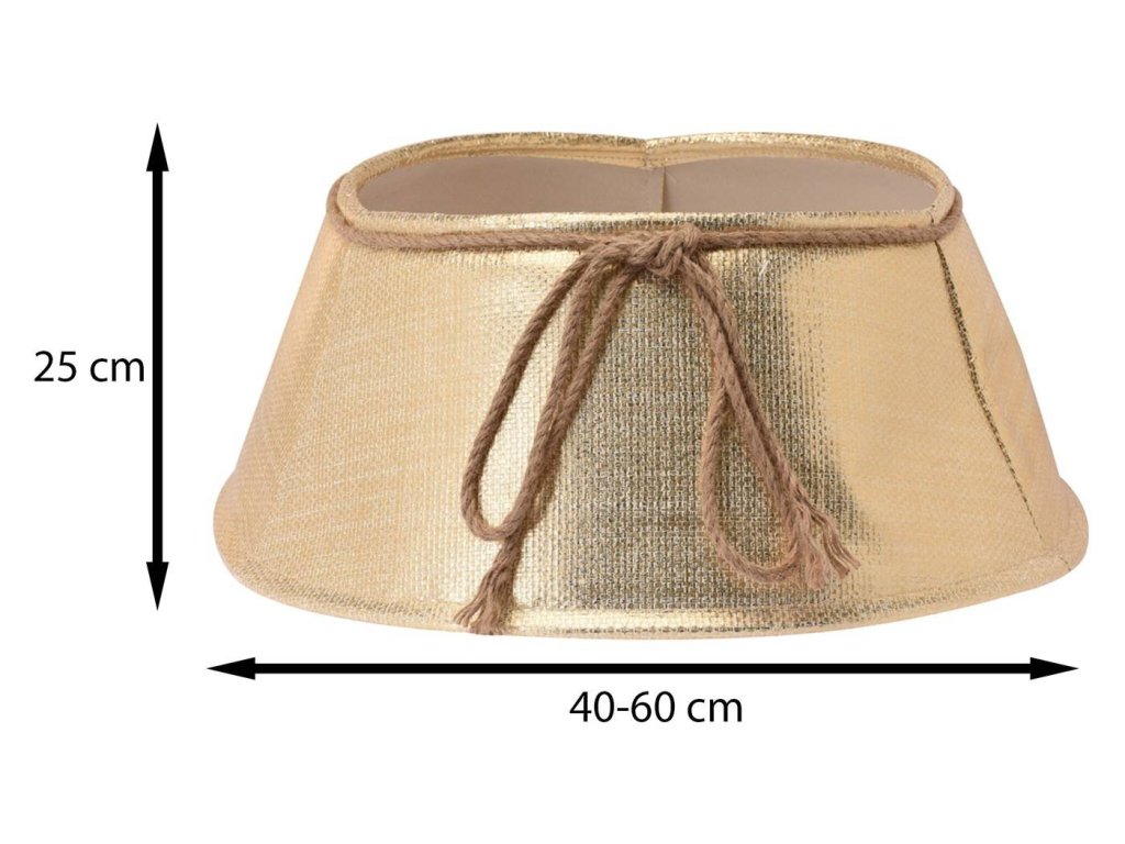 Kryt na stojan pre vianočný stromček s rozmermi 60x40 cm z odolného plastu, ozdobený jutovou šnúrkou v zlatom odtieni. Zlatý obal zakryje nevzhľadne vyzerajúci stojan alebo kvetináč. Univerzálna veľkosť umožňuje použitie krytu s rôznymi hrúbkami kmeňa stromov.